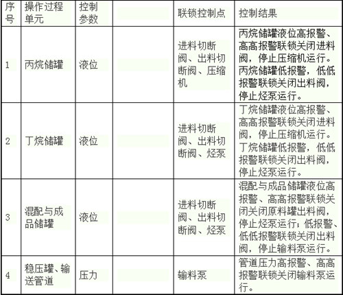根據國家安全生產監督管理總局發布的中華人民共和國安全生產行業標準《危險化學品重大危險源安全監控通用技術規范》AQ3035-2010和《危險化學品重大危險源罐區現場安全監控裝備設置規范》AQ3036-2010的要求,本設計對成品儲罐和原料儲罐壓力進行顯示、記錄和超限報警,對成品儲罐和原料儲罐液位進行顯示、記錄、超限報警和連鎖,對過濾器組進出口壓力、混料泵出口壓力、卸車進出口壓力、輸送緩沖罐、輸送泵壓力進行顯示、記錄和超限報警,對氣霧劑輸送管道壓力進行顯示、記錄、超限報警和連鎖。